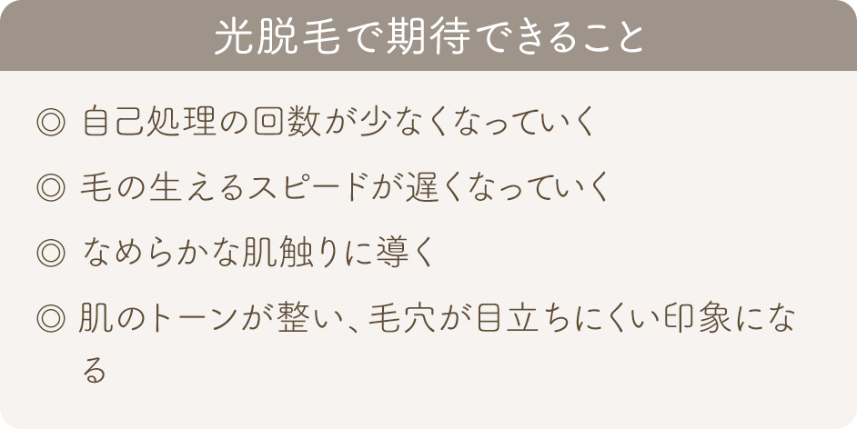 毛のメラニンに反応するIPLの光をあてることで、毛の成長に働きかける美容脱毛です。除毛、減毛を目的とし、ムダ毛の目立ちにくい肌を目指します。また、毛穴の目立ちが気になる方、自己処理による肌負担を減らしたい方にもおすすめです。