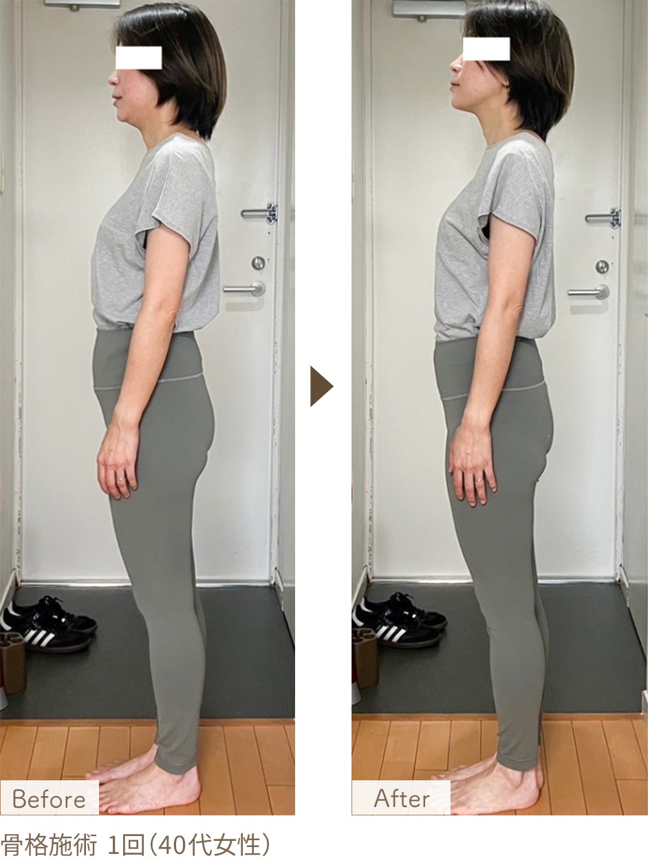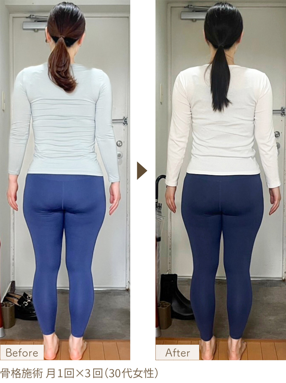 骨格は家で言えば「柱」や「土台」にあたる部分。年月とともに変化するように、私たちの身体も知らず知らずのうちに姿勢やバランスが崩れ、ボディラインや日常の動きに影響を及ぼすこともあります。骨格ボディメイクは、そうした歪みやねじれにやさしくアプローチし、本来のバランスに近づけるサポートを行います。ボディラインが整いやすくなるほか、姿勢がスッと楽になるような感覚を持つ方も多く、内側からの変化を感じていただいています。筋トレなし、食事制限なし。