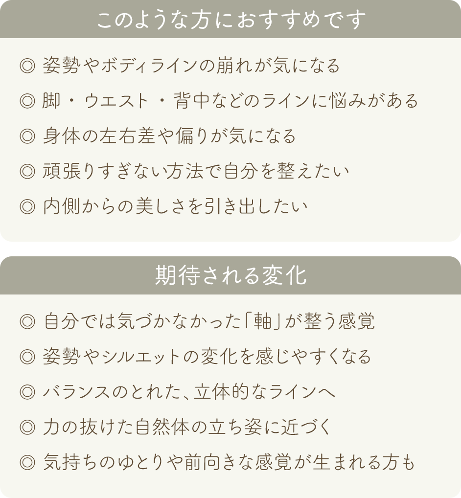 身体を正そうとするのではなく、本来の状態に戻していくことで、自分らしい美しさや心地よさが育っていきます。日々を軽やかに、自分らしく楽しむためのケアとしてぜひ取り入れてみてください。