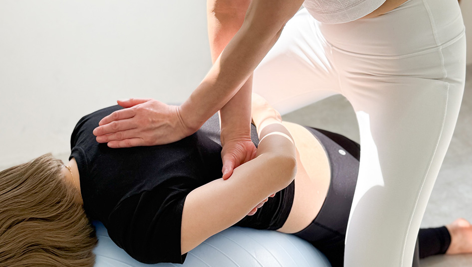 ヨガマットに横になっていただいたり、バランスボールにうつ伏せのままで乗っていただきながら、セラピストがマンツーマンで施術を行います。姿勢や身体のバランスを見ながら優しく丁寧にアプローチしていきます。