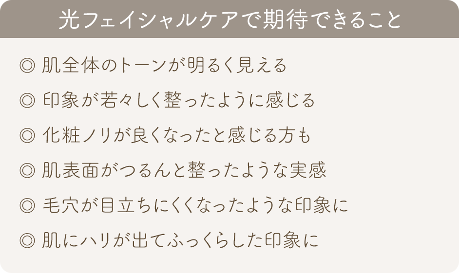 光フェイシャルは、肌に優しいIPLの光をあてることで、肌表面の印象を整えるトリートメントです。くすみや毛穴が気になる方、肌のハリや弾力感を高めたい方におすすめです。うるおいに満ちた明るい印象の素肌を目指したい方に人気のメニューです。