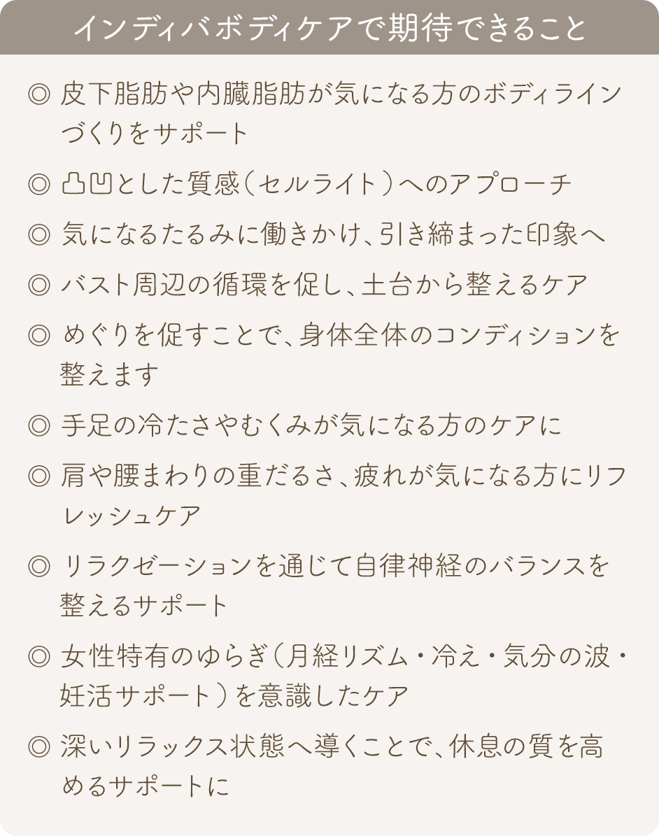 ハンドマッサージでは届きにくい深部の筋肉や、めぐりの滞りが気になる箇所にもアプローチします。冷えによる不調やむくみが気になる方、肩や腰まわりが重く感じる方、健やかなボディラインづくりをしたい方におすすめのケアです。